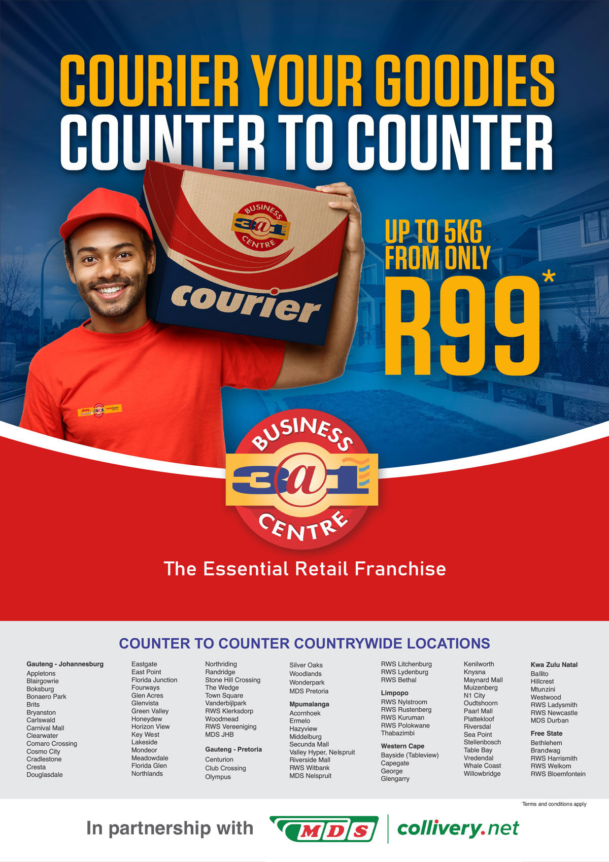 We offer 3 courier services to suit your needs – Local Same Day, Overnight Courier and Economy Road services From as little as R99.00 (T&C’s apply). We also provide international courier with DHL EXPRESS